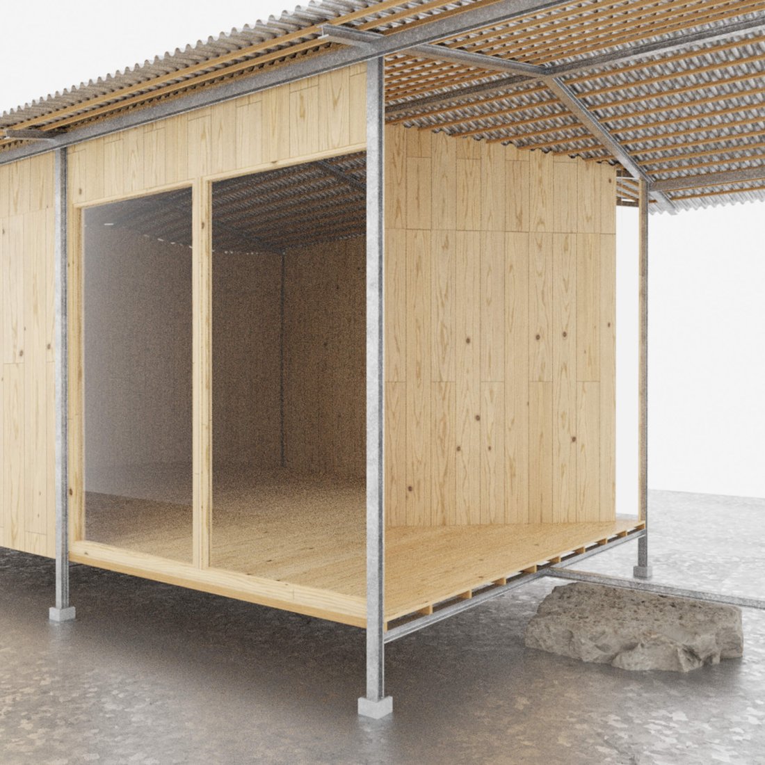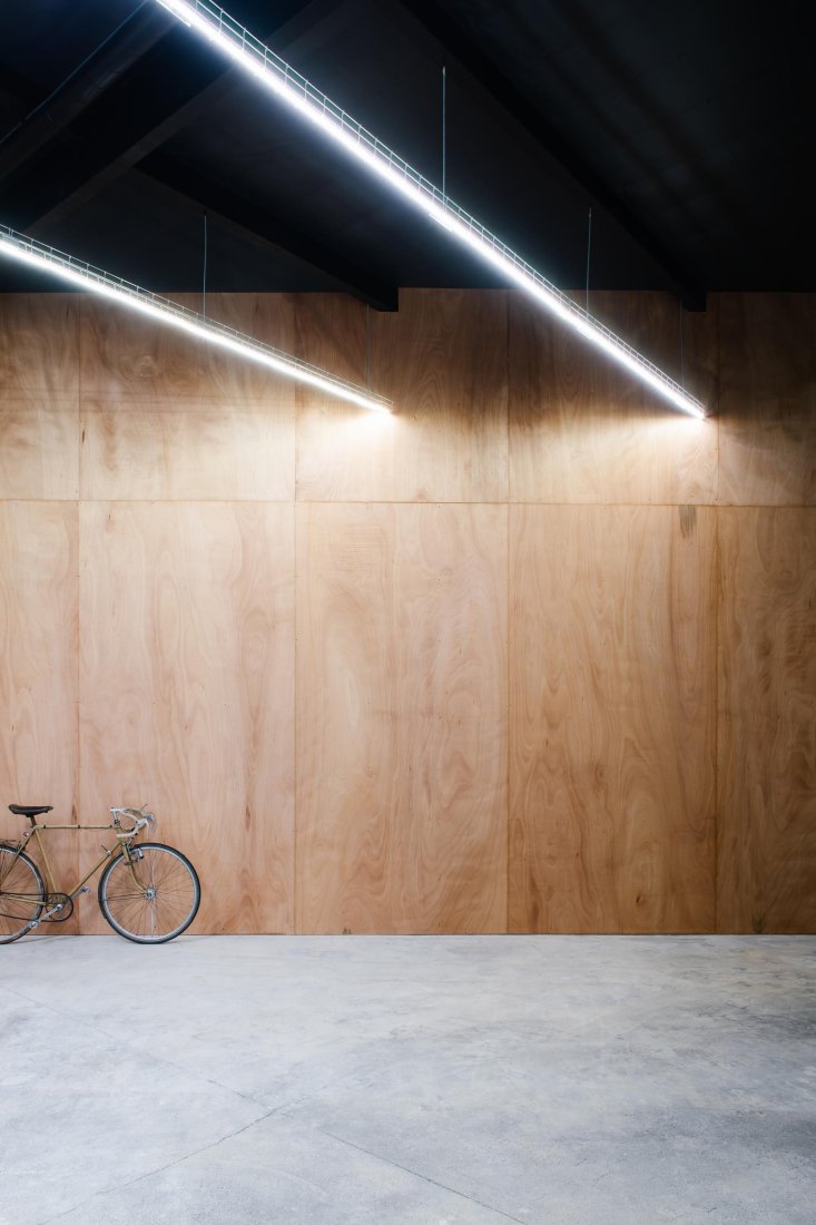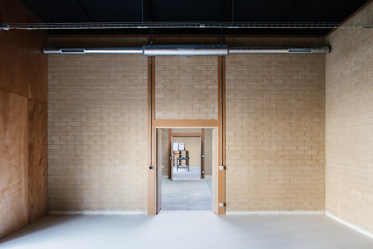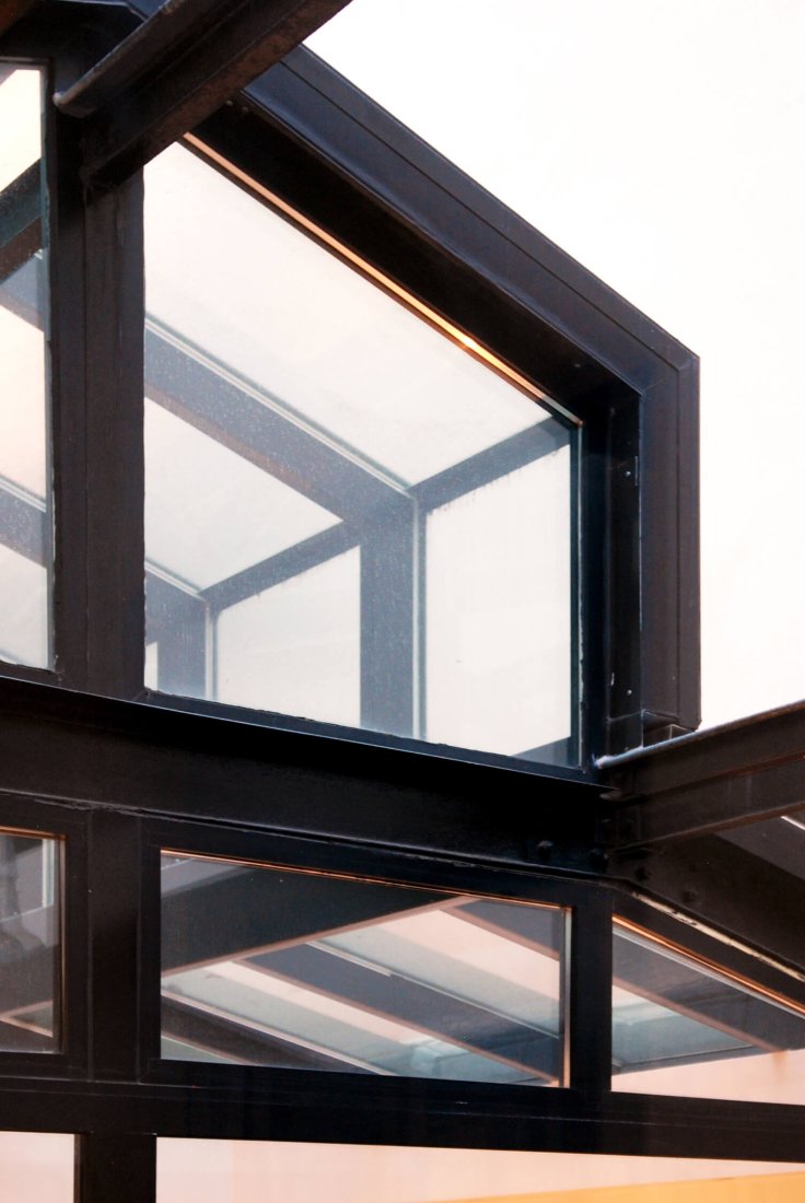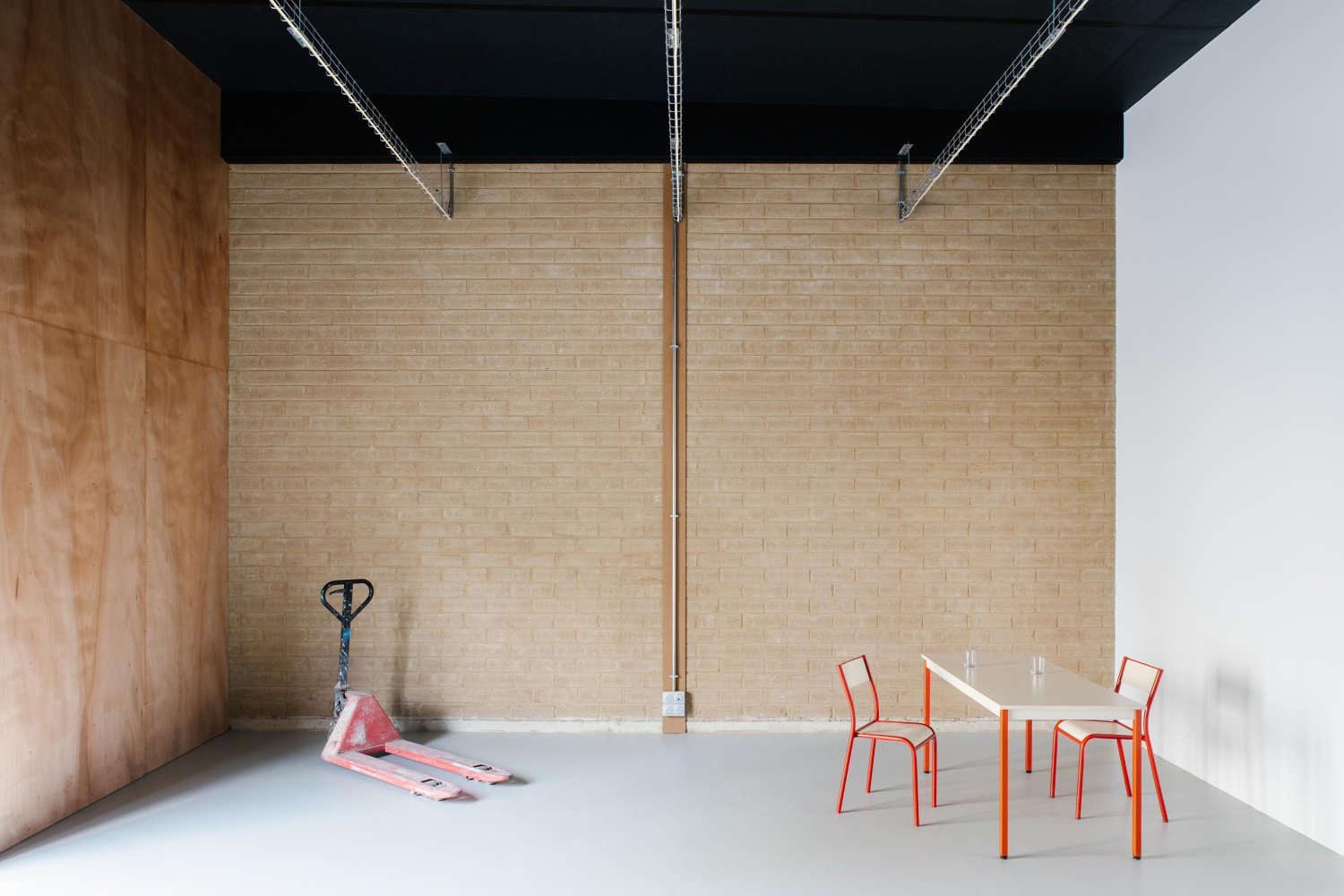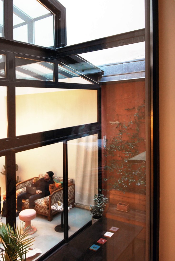 With a tight project budget, the exterior work focuses simply on replacing the large metal shutters with glazed frames to improve interior lighting. For cost reasons, the rest is left in its raw state.