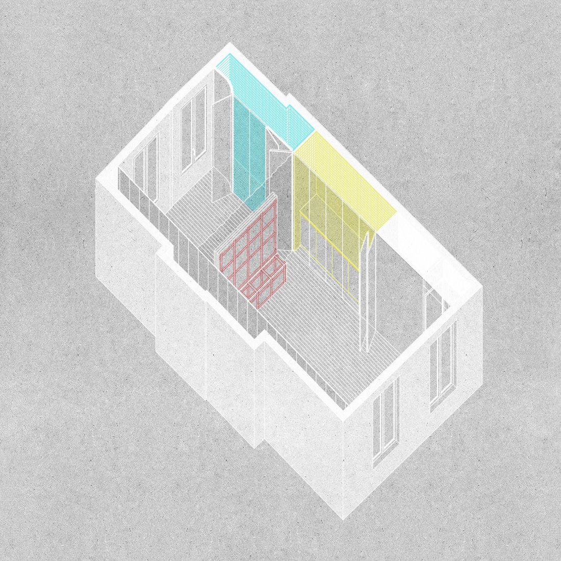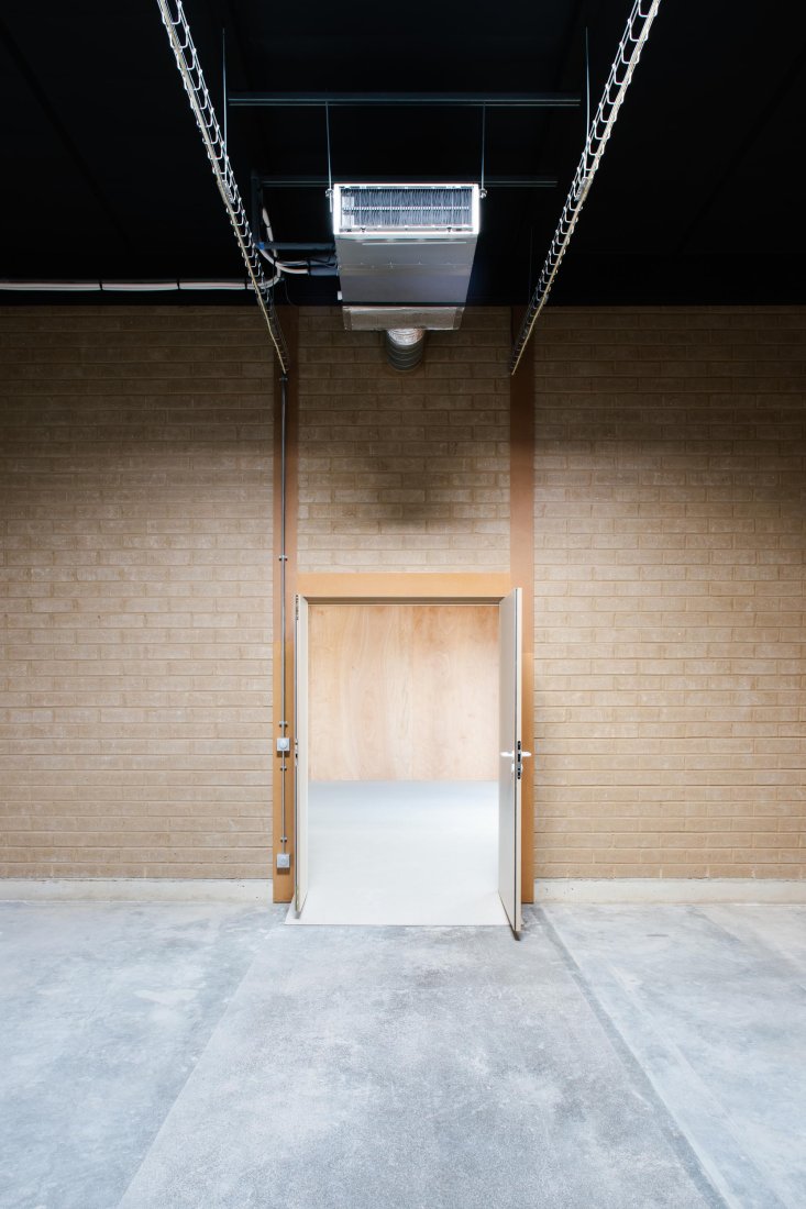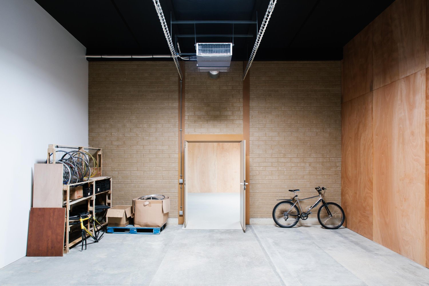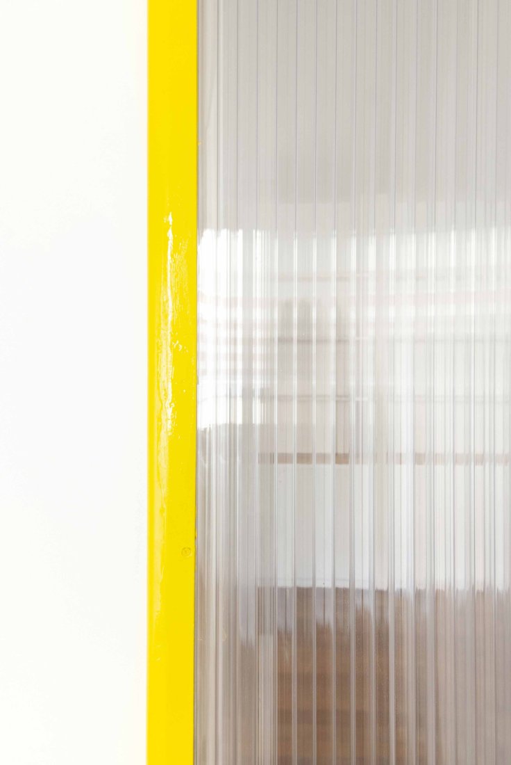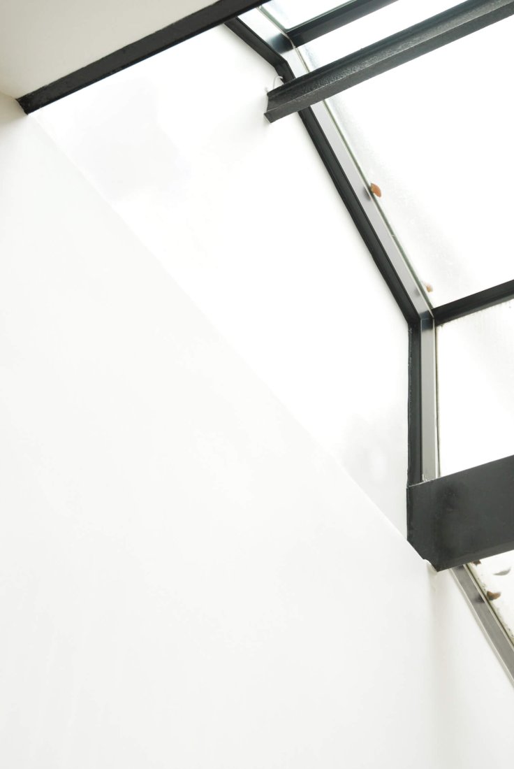 With a tight project budget, the exterior work focuses simply on replacing the large metal shutters with glazed frames to improve interior lighting. For cost reasons, the rest is left in its raw state.