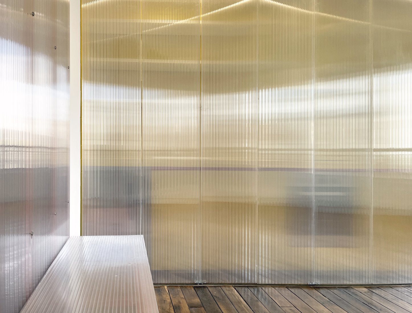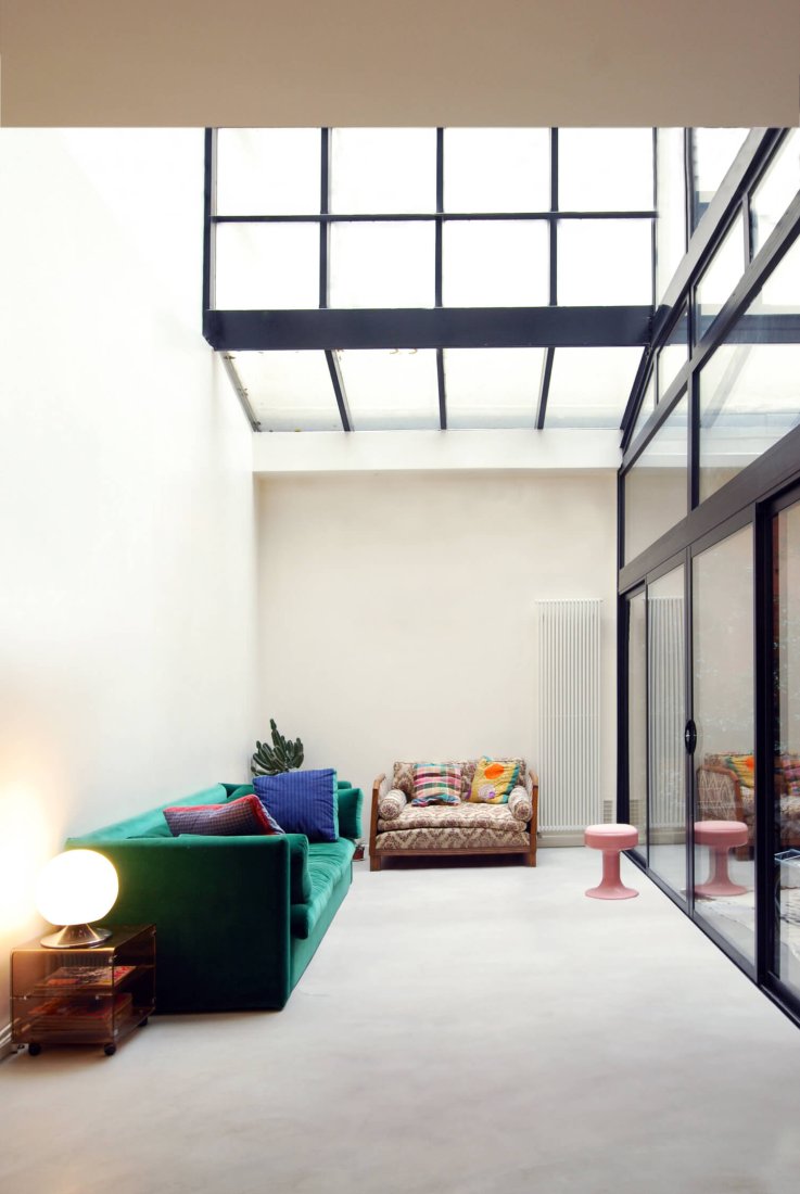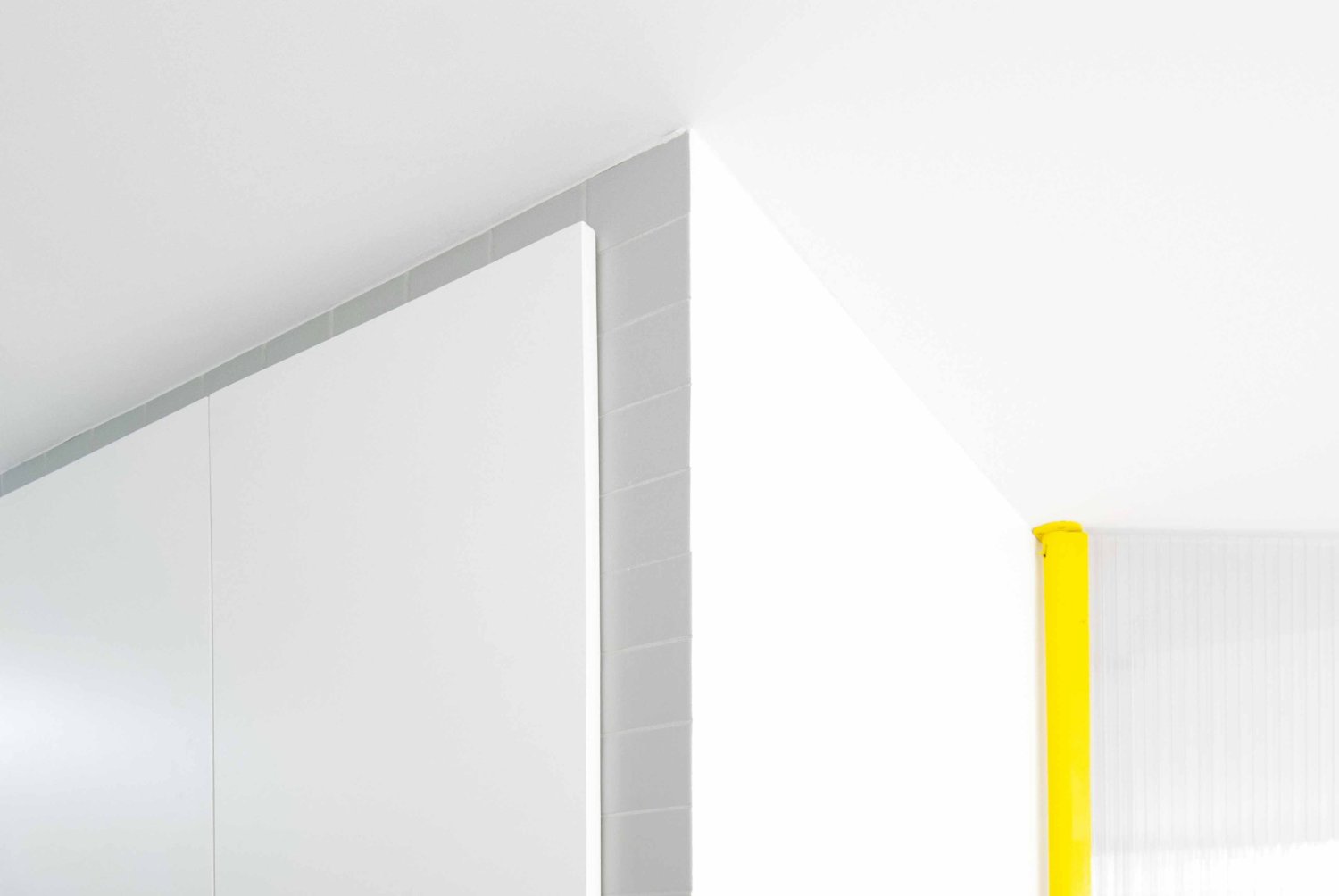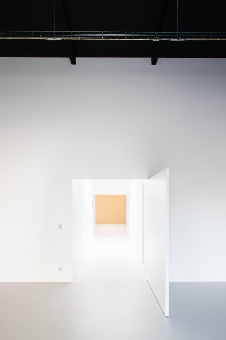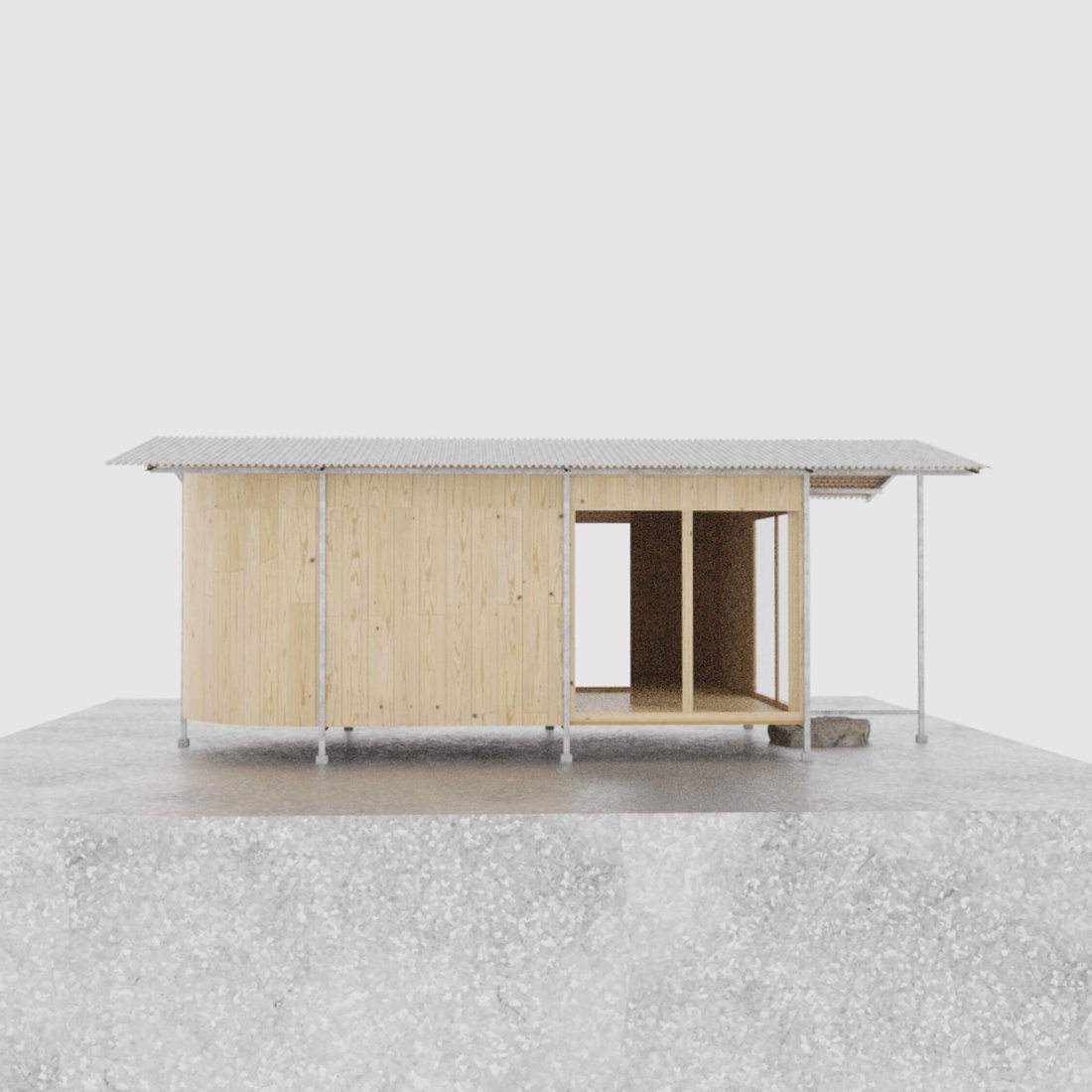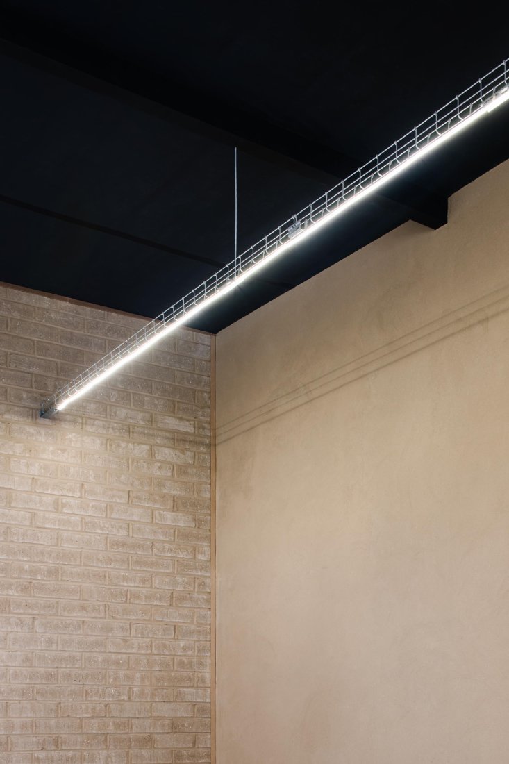 With a tight project budget, the exterior work focuses simply on replacing the large metal shutters with glazed frames to improve interior lighting. For cost reasons, the rest is left in its raw state.