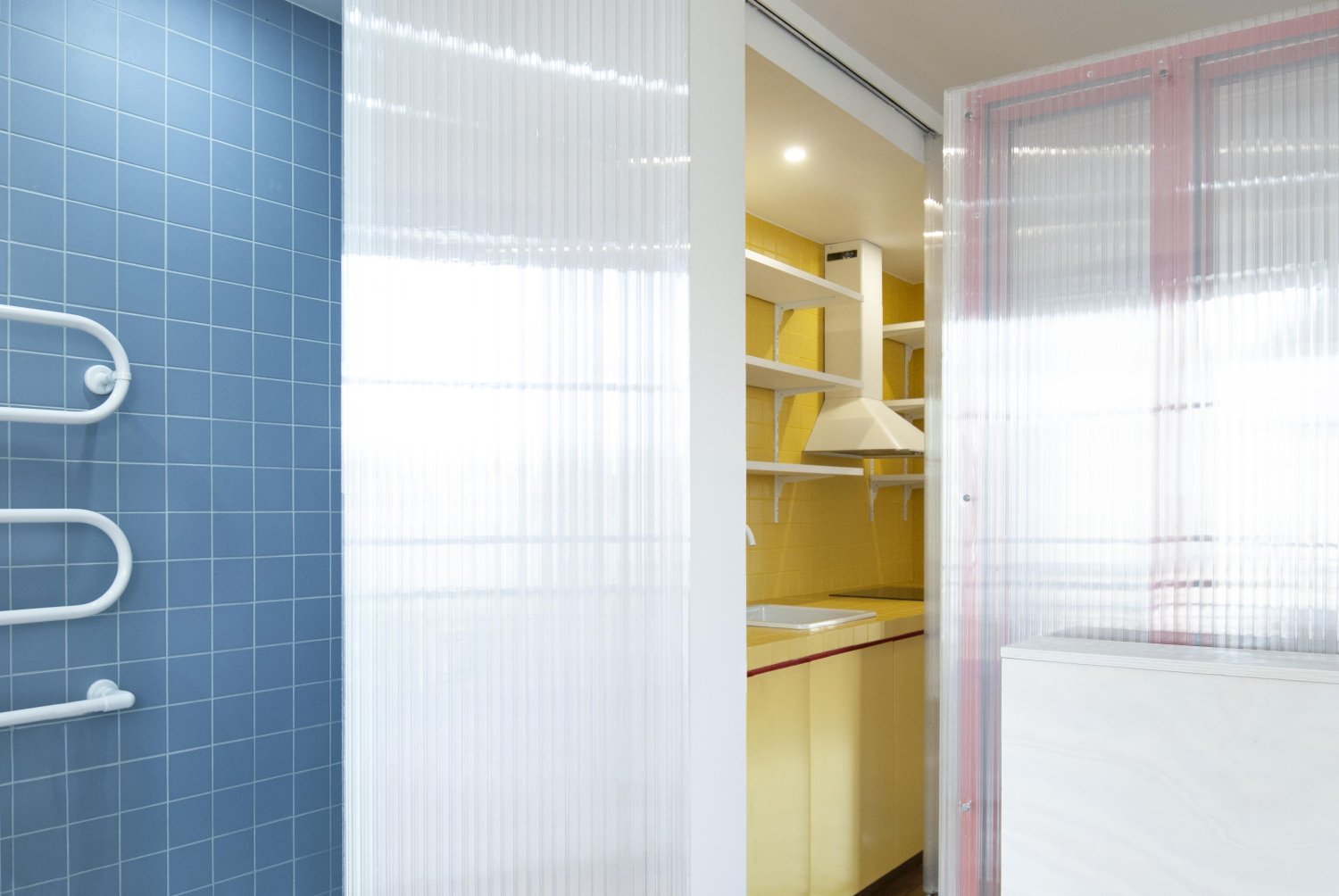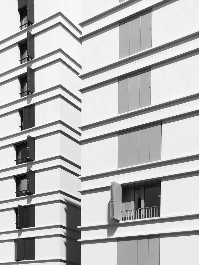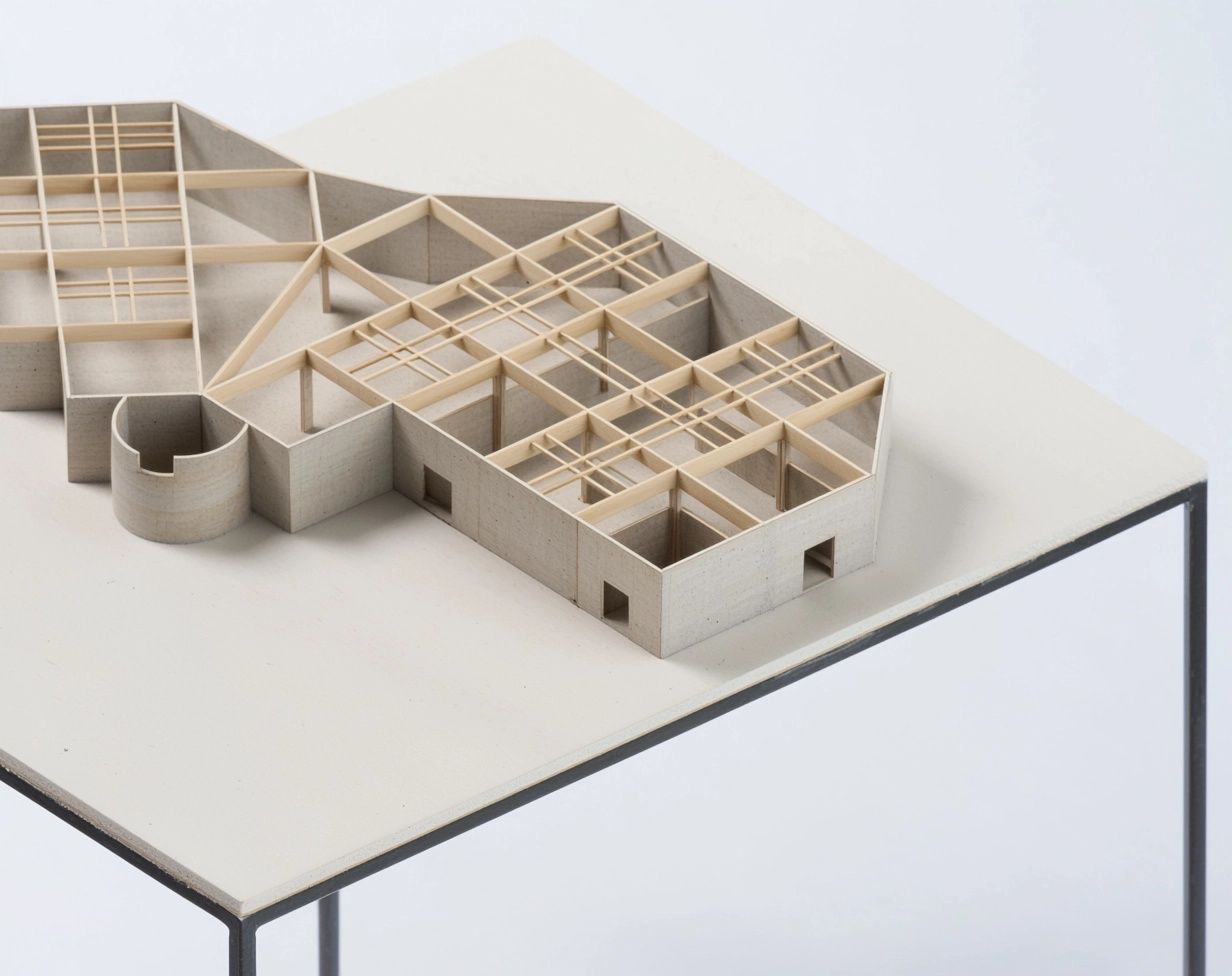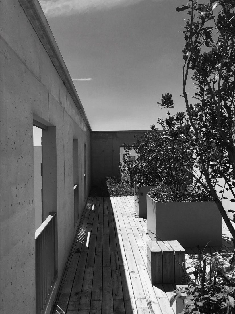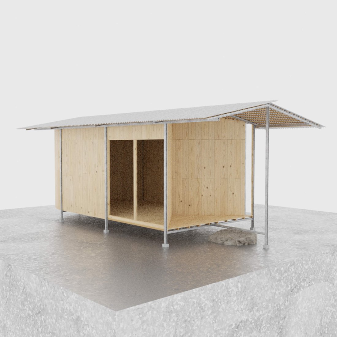 With a tight project budget, the exterior work focuses simply on replacing the large metal shutters with glazed frames to improve interior lighting. For cost reasons, the rest is left in its raw state.
