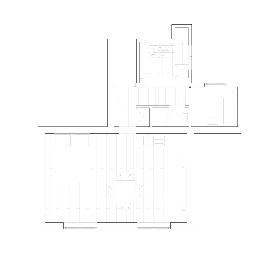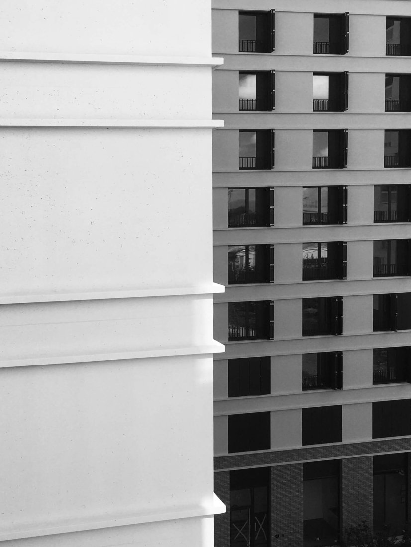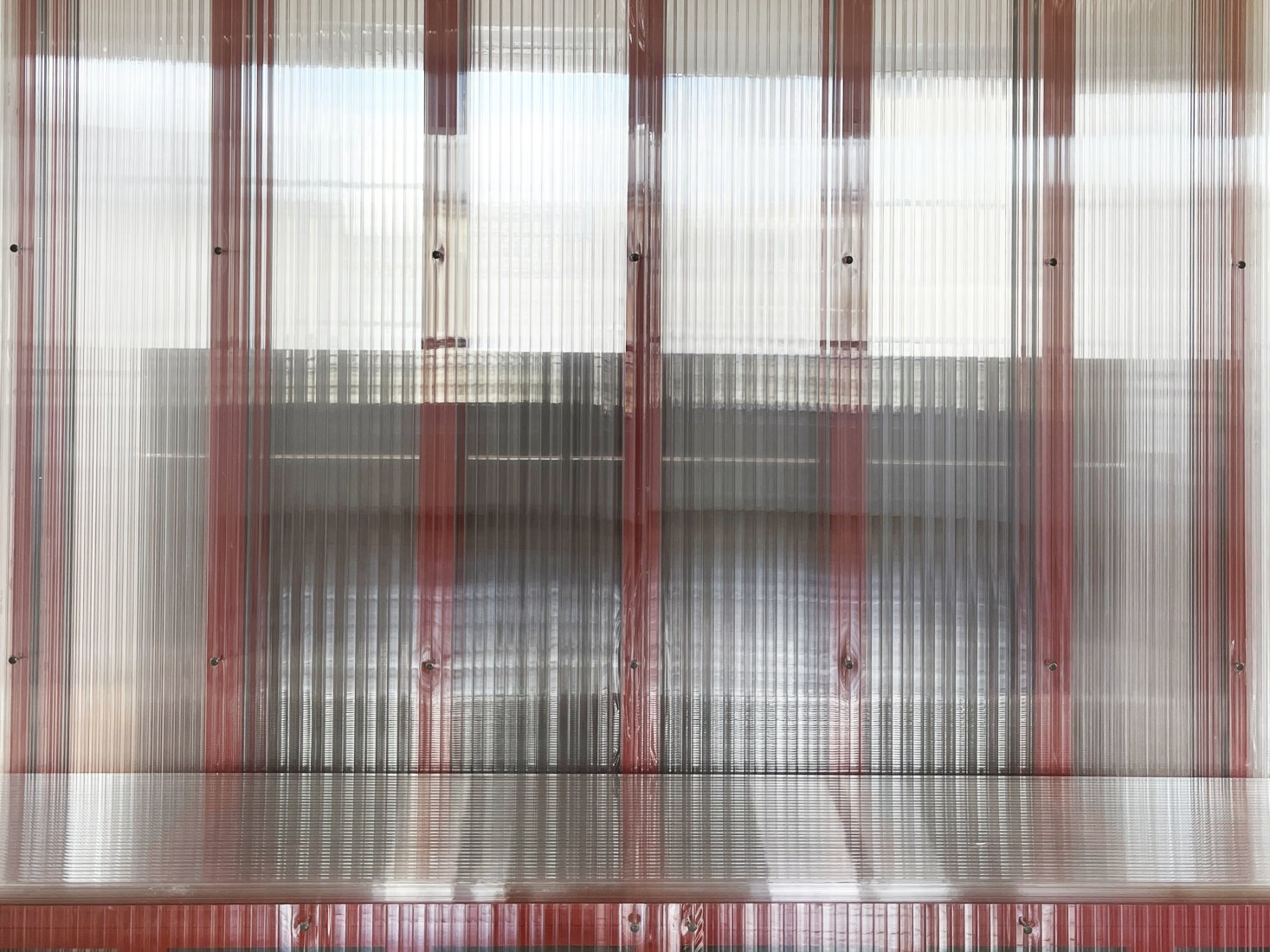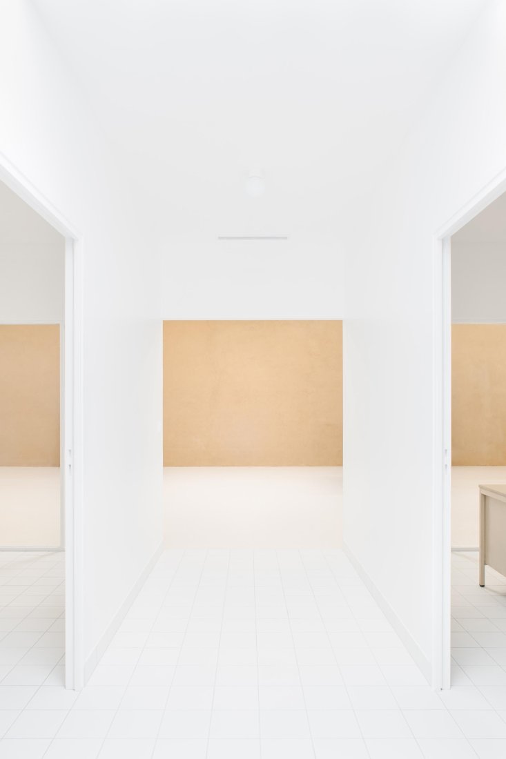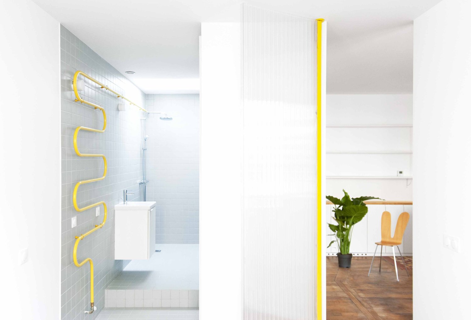 With a tight project budget, the exterior work focuses simply on replacing the large metal shutters with glazed frames to improve interior lighting. For cost reasons, the rest is left in its raw state.