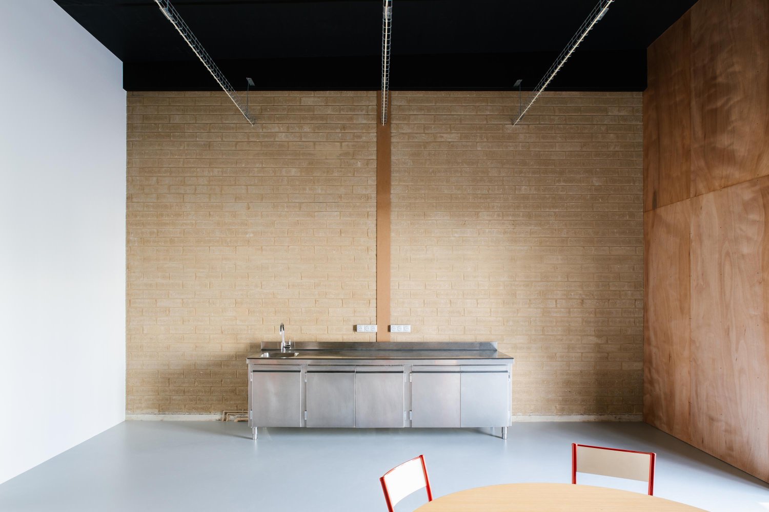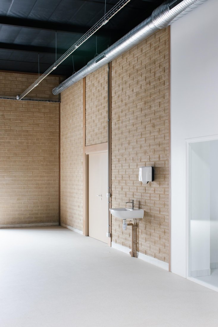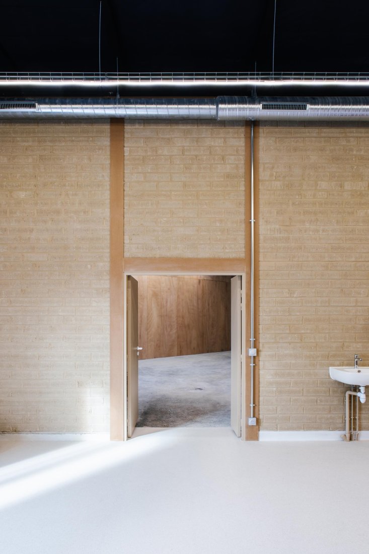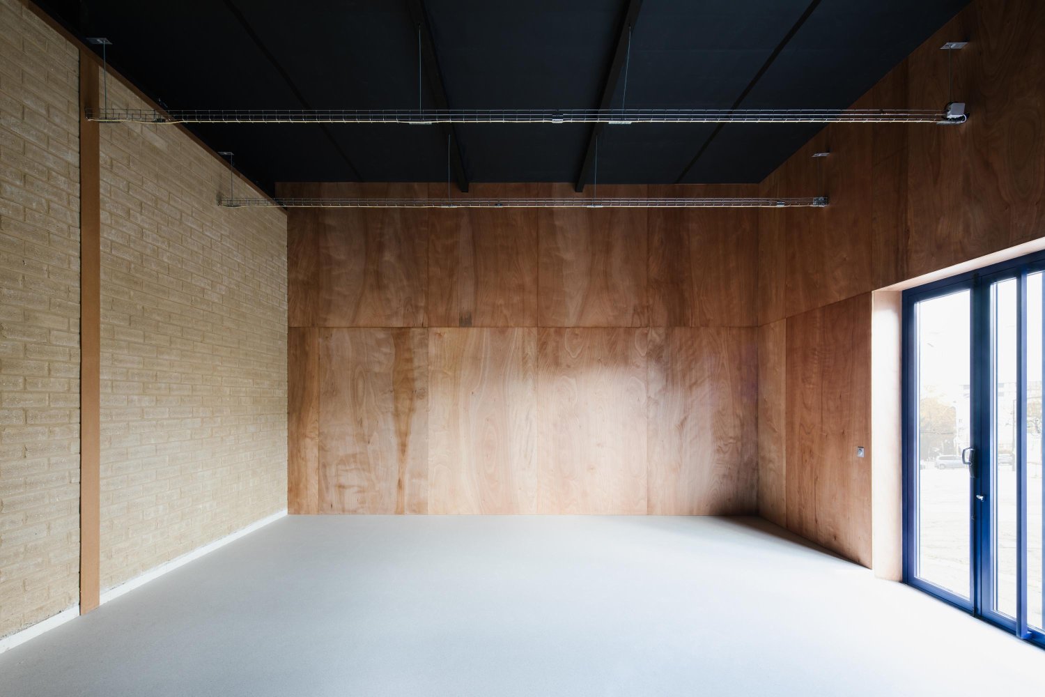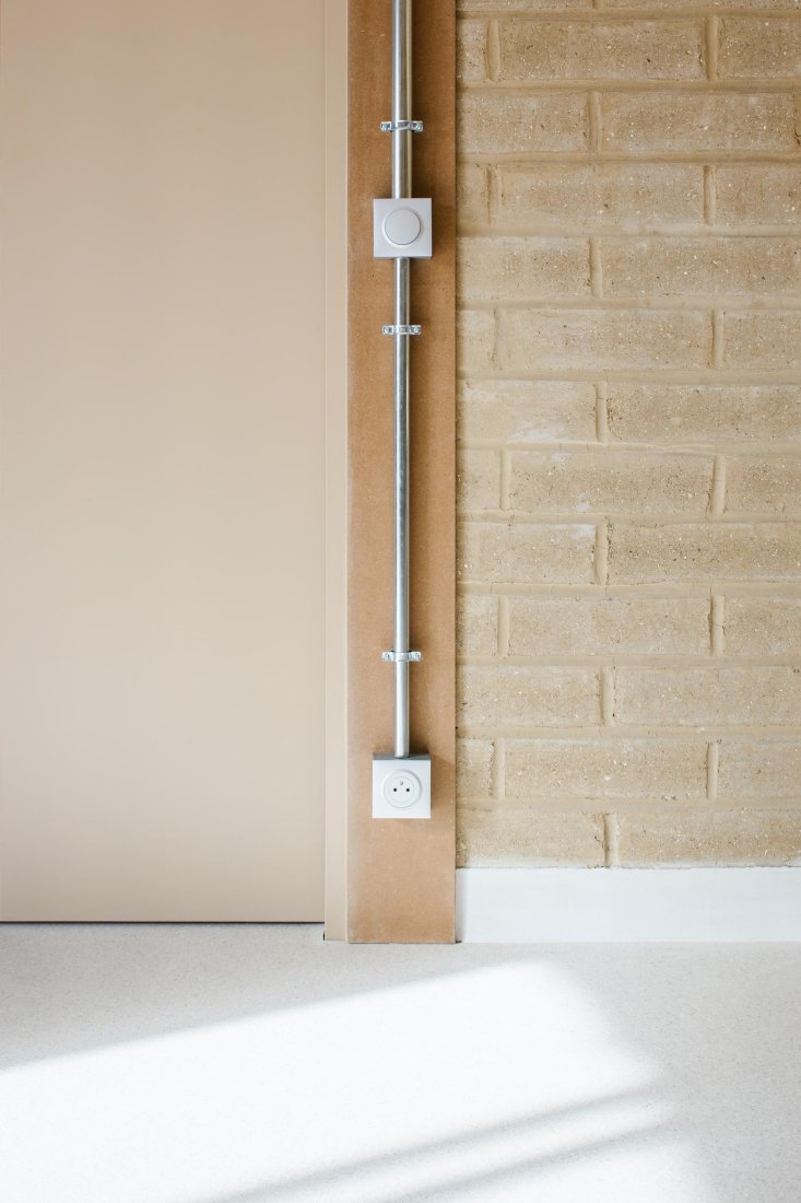 À l’intérieur, l’espace est cloisonné par des cloisons montées en briques de terre de réemploi franciliennes crues et comprimées et par des panneaux de bois bruts. Des matériaux chaleureux comme un contrepoint bienvenu à la dureté du site et du climat social local. Un faux plafond en bois et laine de bois complète l’ensemble pour améliorer le confort thermique intérieur et réduire la consommation énergétique globale. Ici, ce sont des matériaux locaux et durables qui répondent aux enjeux sociaux et environnementaux soulevés par le site.