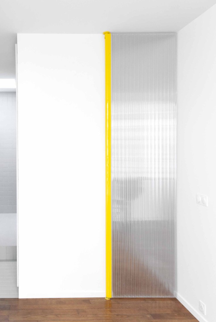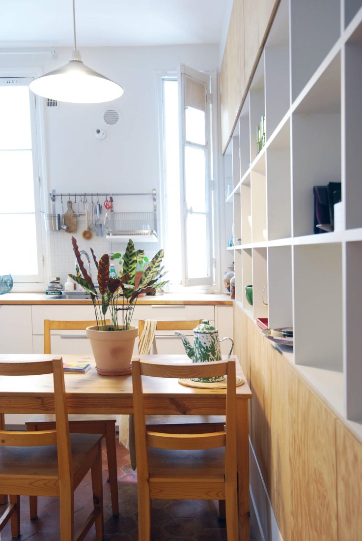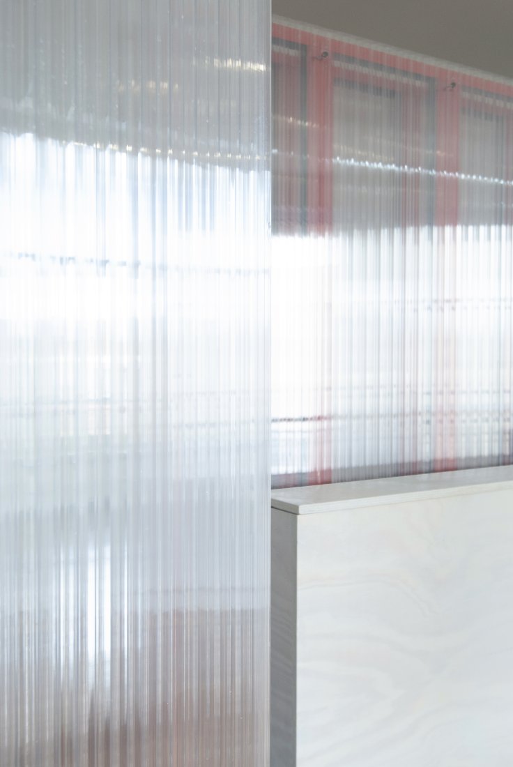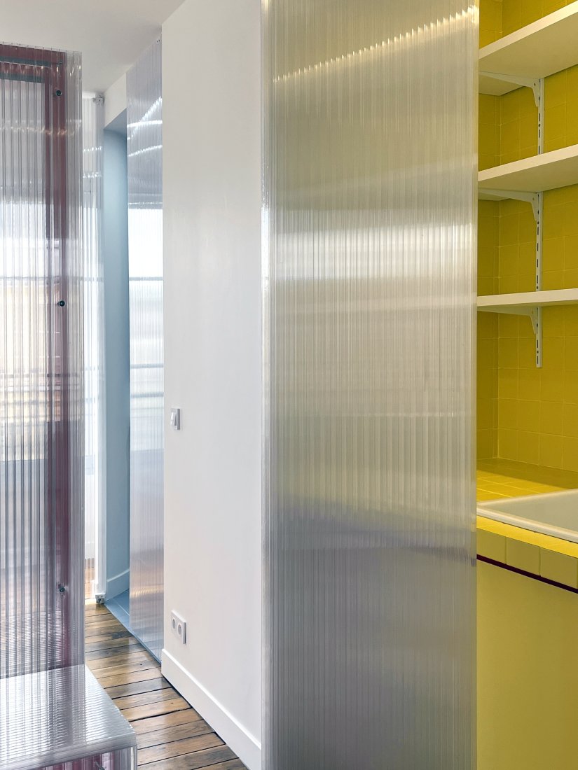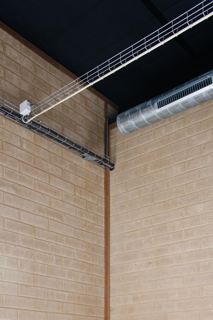 À l’intérieur, l’espace est cloisonné par des cloisons montées en briques de terre de réemploi franciliennes crues et comprimées et par des panneaux de bois bruts. Des matériaux chaleureux comme un contrepoint bienvenu à la dureté du site et du climat social local. Un faux plafond en bois et laine de bois complète l’ensemble pour améliorer le confort thermique intérieur et réduire la consommation énergétique globale. Ici, ce sont des matériaux locaux et durables qui répondent aux enjeux sociaux et environnementaux soulevés par le site.