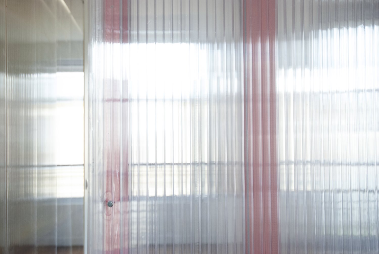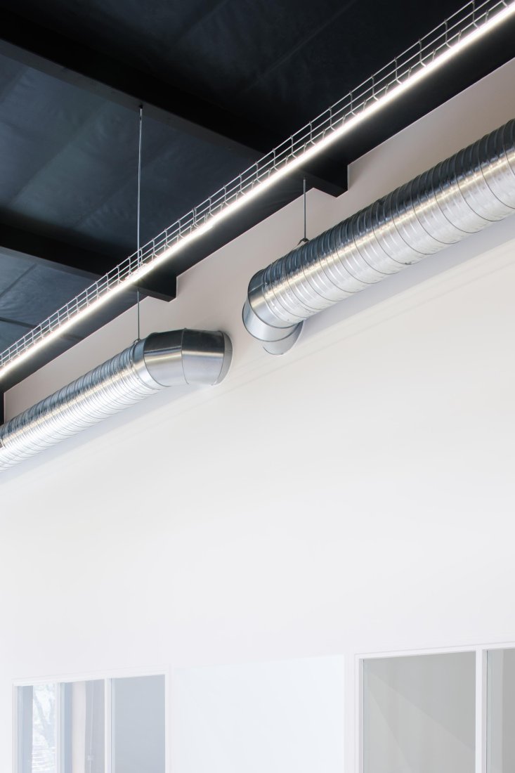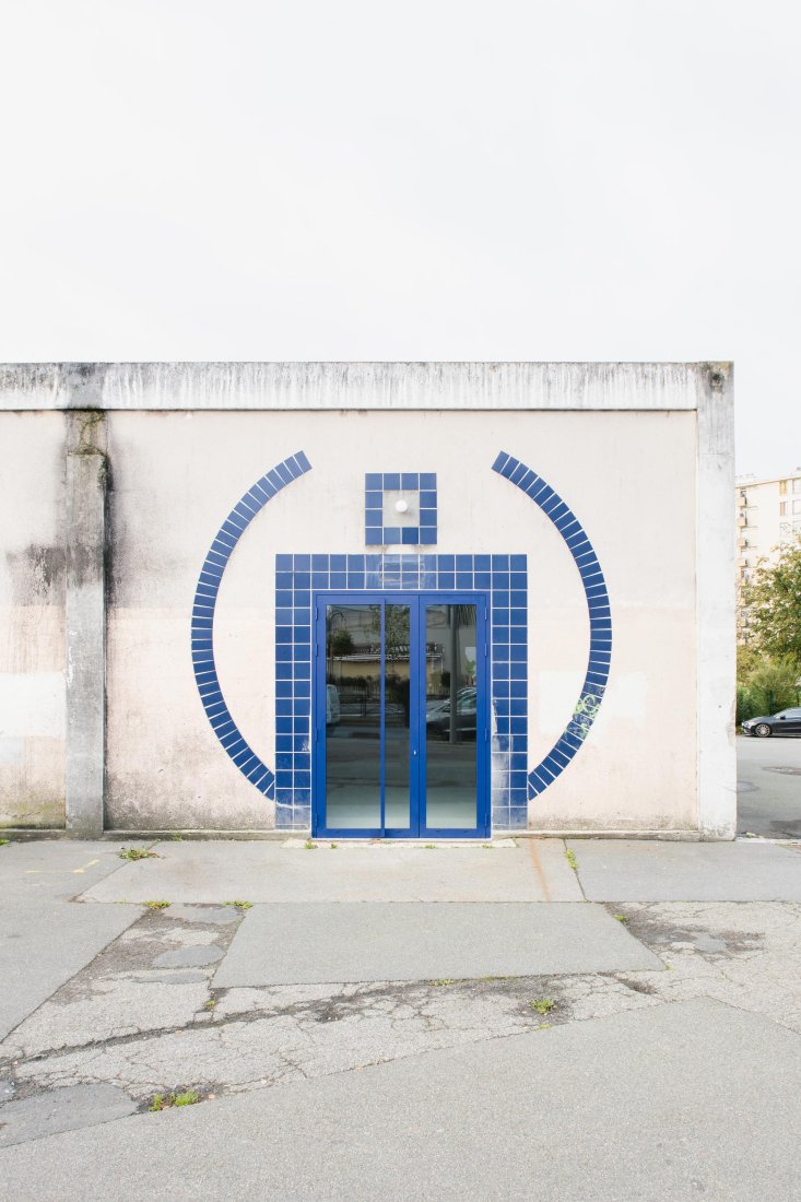 Dans une économie de projet serrée, le travail sur l'extérieur vise très simplement à remplacer les grands rideaux métalliques par des châssis vitrés pour améliorer l’éclairage intérieur. Le reste par économie est laissé brut.